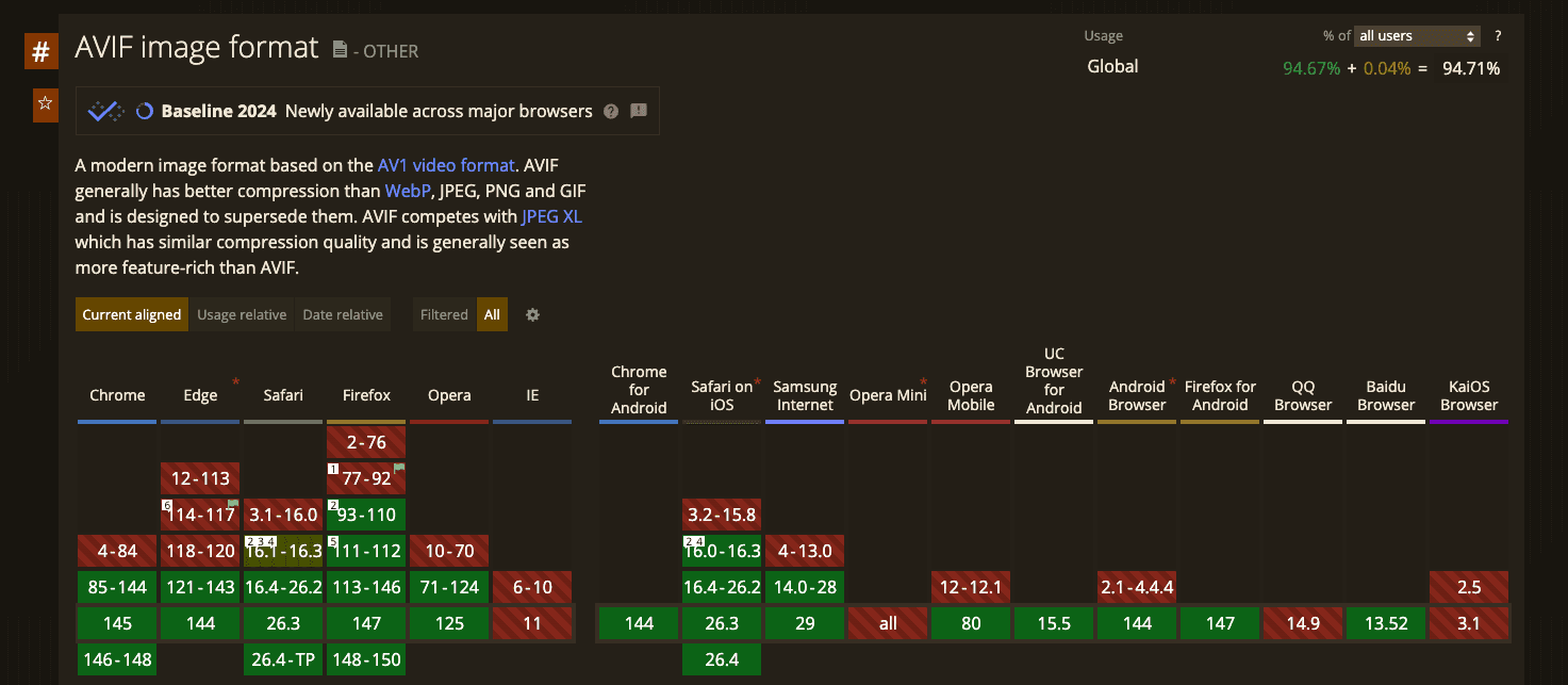 - AVIF 자체는 지원하지만, 애니메이션 AVIF의 투명도는 제대로 렌더링되지 않습니다.
