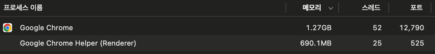 const file = new Blob(parts);다운로드가 진행될수록 노트북이 뜨거워지고 배터리가 빠르게 소모되었습니다. 활성 상태 보기를 확인해보니 Chrome 프로세스의 메모리 점유율이 16.49GB까지 올라가 있었습니다.