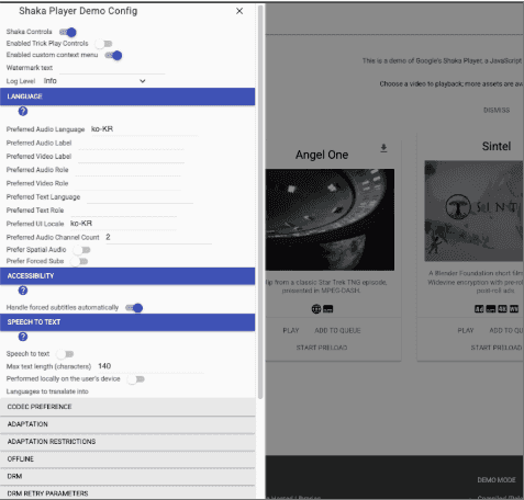 });위처럼 설정할 수 있었습니다. 영상에 한국어(ko)와 영어(en) 트랙이 모두 있으면 Shaka Player가 알아서 한국어 트랙을 선택해줍니다. 언어 외에도 채널 수나 코덱 같은 세부 조건도 설정할 수 있었습니다.