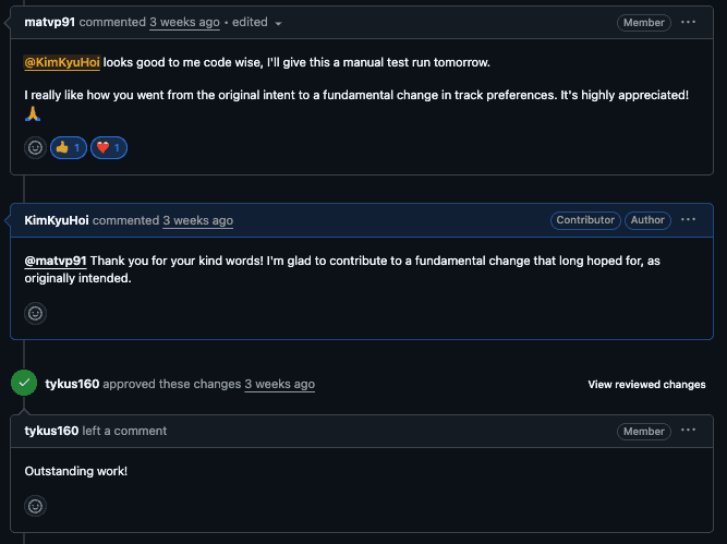 처음엔 언어 배열 확장이었던 PR이 트랙 설정 전체의 재설계로 이어진 과정을 알아봐줬다는 게 뿌듯했습니다.