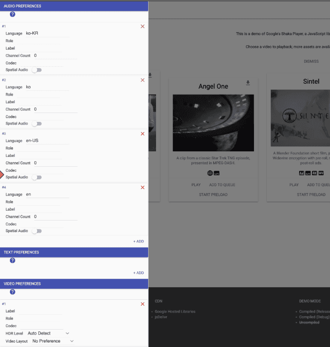기존 데모 UI는 Preferred Audio Language, Preferred Audio Role, Preferred Audio Channel Count 같은 필드들이 각각 개별 텍스트 입력으로 나열돼 있었는데요.